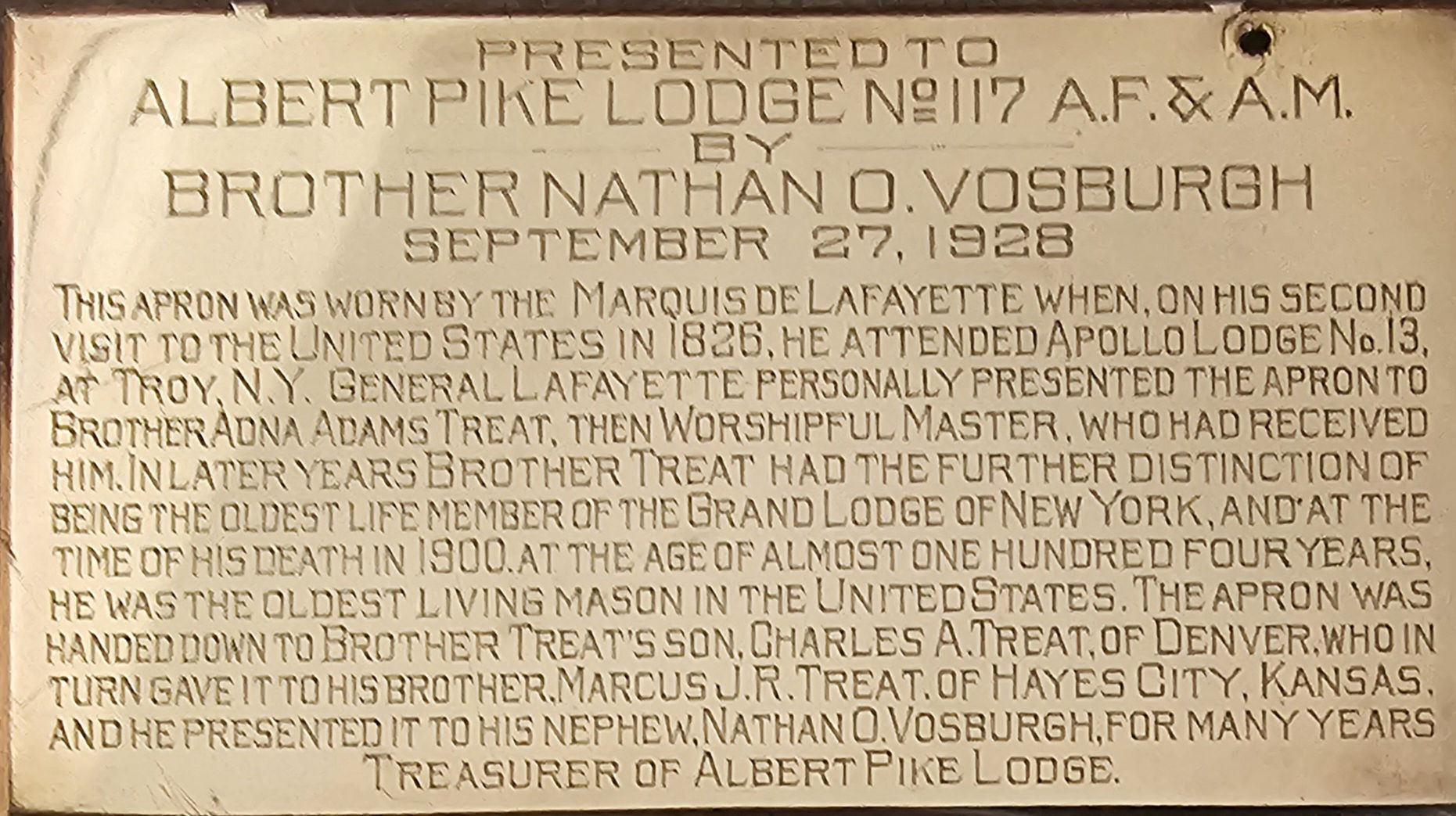 The apron was handed down to WB Treat’s son, who in turn gave the apron to his brother, who some years later presented it to his nephew, Worshipful Brother Nathan O. Vosburgh — then the Treasurer of Albert Pike Lodge. On September 27th, 1928, WB Vosburgh officially presented the Lafayette apron to Albert Pike Lodge No 117.